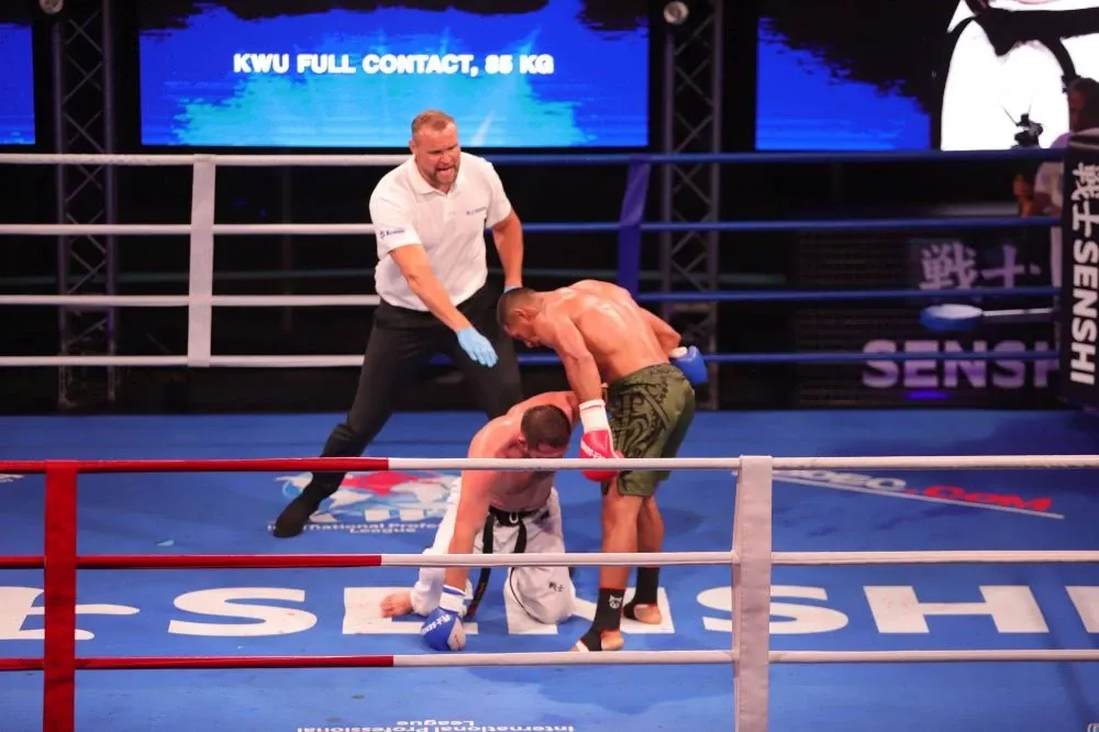 В основното събитие на вечерта кикбоксьорът с актив от 20 победи и само 1 загуба спря впечатляващата серия на Андрей Чехонин след 4 рунда екшън в Камчия.